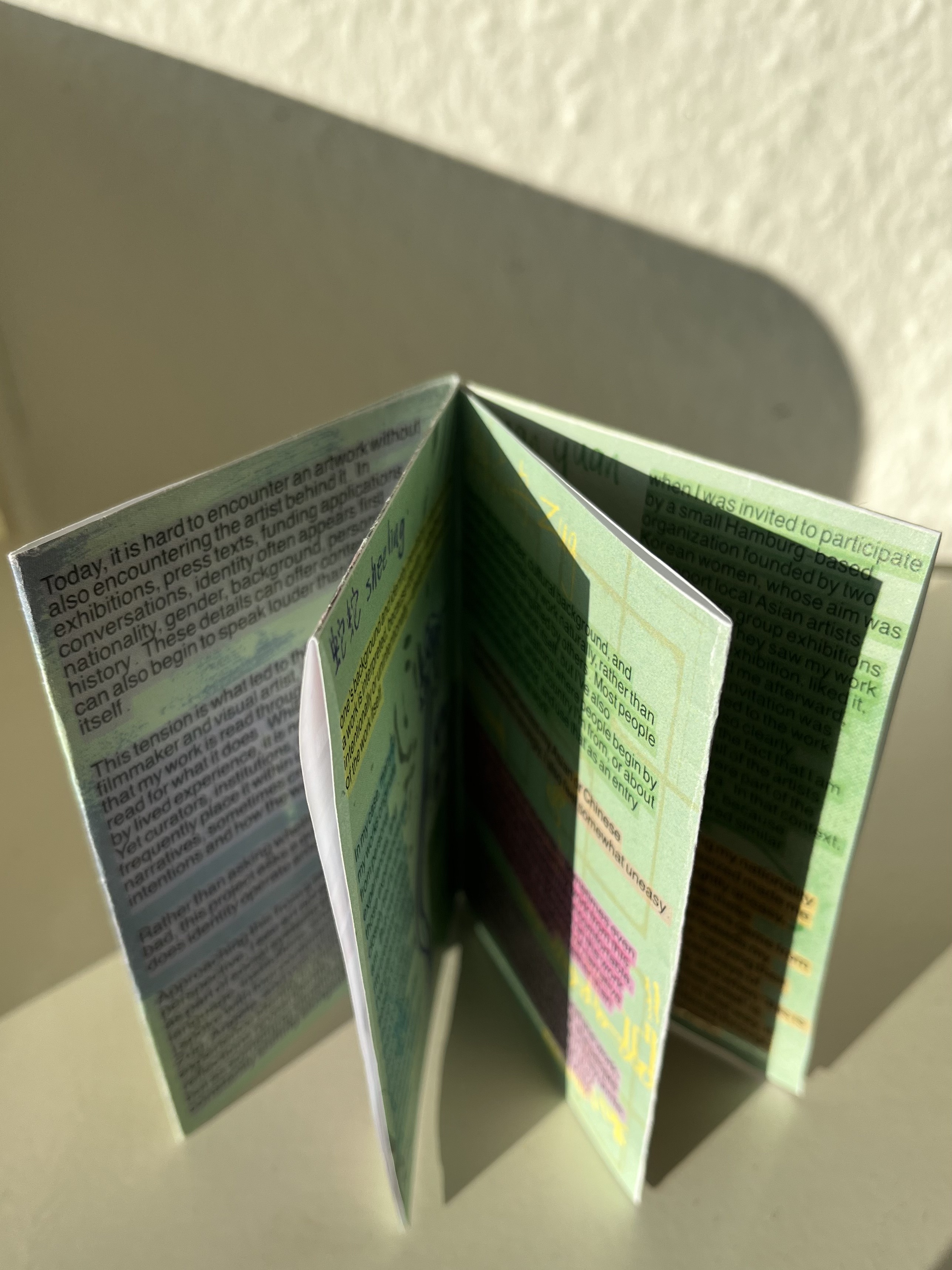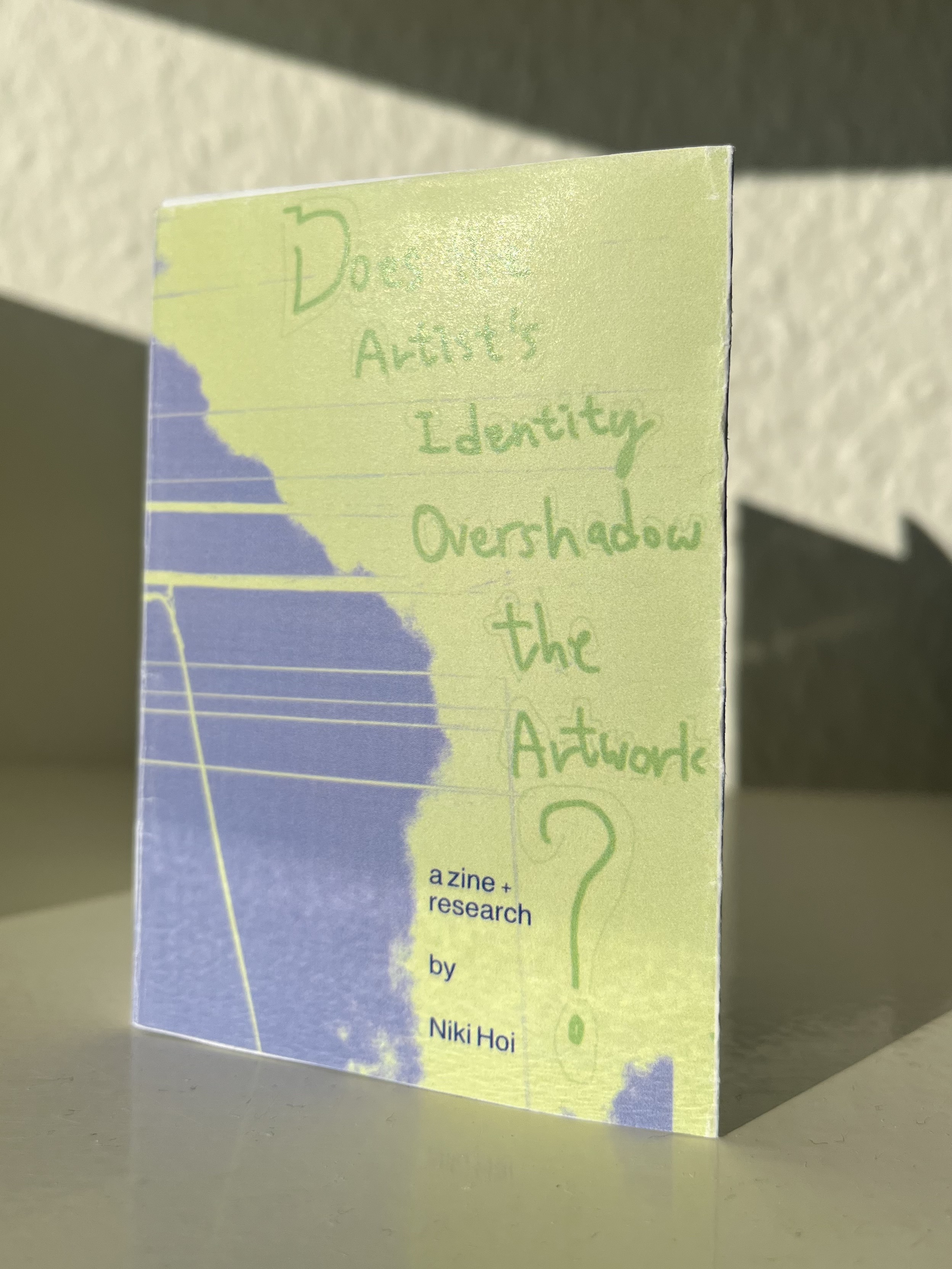 This zine grew out of a research project based on interviews with four emerging contemporary artists. In the art world, things like exhibition texts, press releases, funding applications, and even casual conversations often focus heavily on an artist’s background—such as nationality, gender, or personal history. While this context can add meaning, it can also take attention away from the artwork itself. This project looks at that tension and asks: when does an artist’s identity start to overshadow the work, and how do artists deal with that?