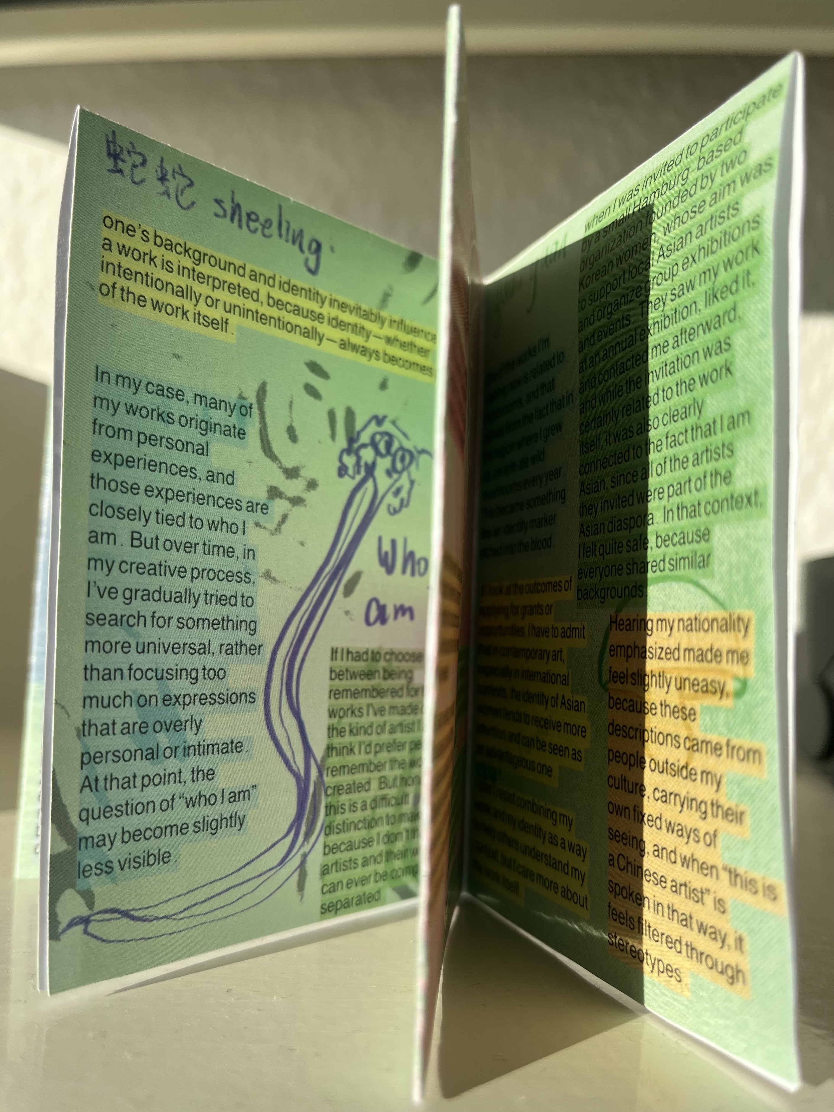 To explore this, I conducted interviews with four artists—sheeling, Zug, Angela Hoi, and yuan yuan—alongside observations and existing research. The interview recordings became the core material for an eight-page zine, which turns selected quotes into a visual format. The zine can be shared as a PDF or printed on a single A4 sheet and folded into a DIY zine.